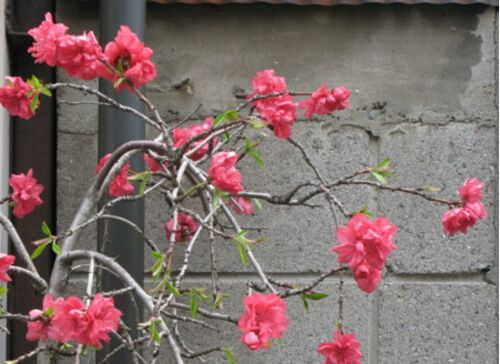 ひなまつりの花として日本でも古くから馴染みの深いモモ(桃、Prunus persica) のうち鑑賞用品種を一般にハナモモ(花桃)と呼ぶ。八重咲きの桃色花が普通だが、このように緋赤色の花も多い。 モモの原産地は中国とされるが、日本では弥生時代や縄文時代のモ…