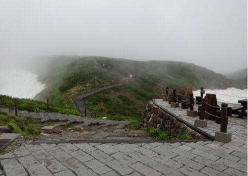 二日目は一日中雨が降り続いたので、終日宿の中でごろごろ過ごした。それでも運良く温泉だったので、朝寝・朝酒・朝湯と小原庄助を満喫してしまった。 三日目の朝もまだ雨が降ったり止んだりで、霧と雲がたれ込め視界は100mあるかないかの悪天候だった。室堂…