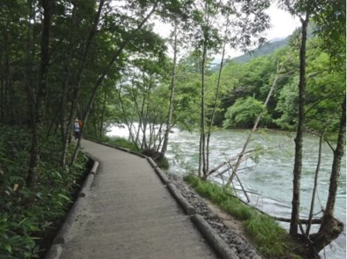 田代橋を渡って、疲れた者は真っ直ぐ帝国ホテルへ休憩に向かい、残りは梓川左岸を田代池に向かう。水量も増え、川幅が狭くなって、梓川の流れを手に取るように近くで見ることになる。 雨も上がり、川岸に下りることができるところでは、川の流れる様を写真に…