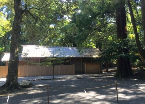 五丈殿の先には、左手に忌火屋殿が見える。内宮境内にある各神殿に供える神饌を調理する所。御火鑚具(火きりの杵と檜の板)を用いて得た忌火(清浄な火)で調理し、辛櫃に入れ、さらに御祓いを行い供える。建物は切妻、妻入、素木造で、屋根は二重、煙出し…