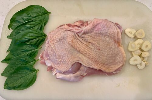 鶏もも肉とバジルとニンニク 庭のプランターでバジルが育ったので、鶏もも肉のバジルとニンニク挟み焼きを試して見た。大きめの鶏もも肉一枚につきバジル6枚、ニンニク一片のスライスを用意する。 鶏もも肉にバジルとニンニクを挟む 鶏もも肉の余分な脂肪を…