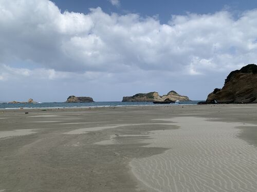 浜田海水浴場 このだだっ広い浜田海水浴場は、遠浅できめ細かな白砂が美しいビーチで、夏場は海水浴客で賑わう。右手に見える島は、竹島と高島が重なり、その左に浜島がある。 千座の岩屋 象の水飲みのあった竹崎海岸も美しい景観に恵まれた砂浜で、風向きに…