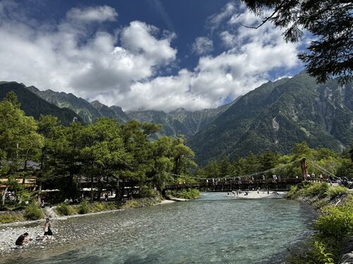 上高地、河童橋 乗鞍畳平の翌日は上高地を散策した。今までは上高地に来ると、河童橋で梓川を渡りウェストン碑を見て、田代橋から田代湿原を通り抜けて大正池まで歩くのが定番だったが、今回は特に足腰が弱っているので、河童橋周辺をゆっくり見て回ることに…
