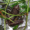 確かシロ2世はメスのはずだがと首をかしげていると、7mほど離れたところに作ってあった、離れビオトープでカエルの鳴き声がした。小網で捕まえてみると、1月に火鉢で保護したカエルだった。