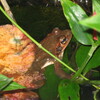 小雨がぱらついているとはいえ、珍しく昼にヤマアカガエルの鳴き声が聞こえた。ビオトープを覗いてみると、シロ2世がゆったりと身体を伸ばしている。