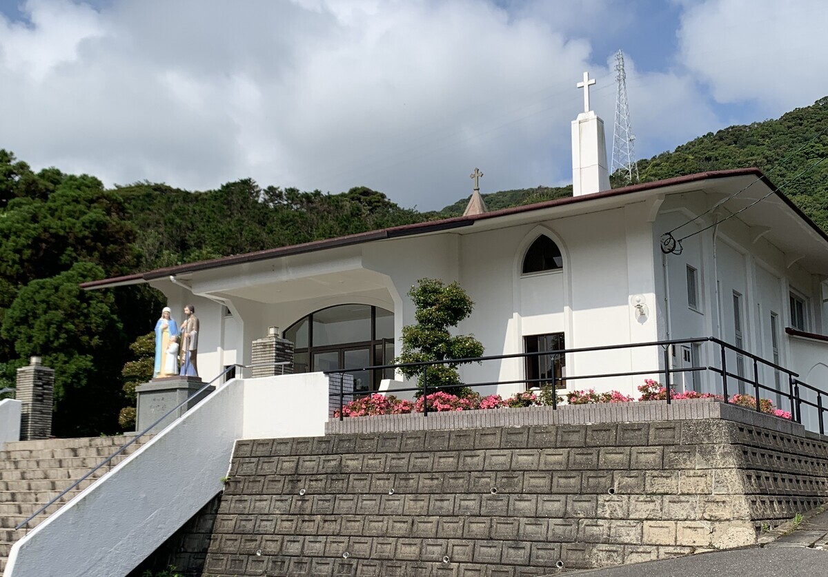 翌日は中通島の南半分を教会巡りする。まずは有川港から南下し、鯛ノ浦教会を訪れる。鯛ノ浦の集落は、寛政9年(1797)に外海の出津(そとめのしつ)から移住してきたキリシタンの子孫が住み、明治3年(1870)鯛ノ浦六人斬りという殉教事件が起きるなど迫害を受けた。明治13年(1880)パリ外国宣教会のブレル神父により、現在の「希望の灯学園」の前身である養育院が建てられた。翌年、旧鯛ノ浦教会堂が建立され、明治36年(1903)旧聖堂がアルフォンス・クザン司教により祝別された。この現聖堂は昭和54年(1979)里脇大司教により献堂された。聖堂入口手前には、守護者・聖家族像が安置されている。