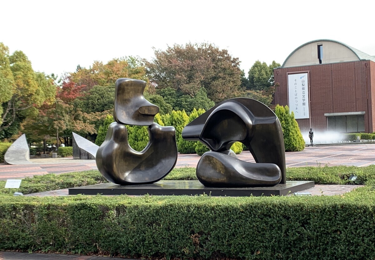 文学館前のこの彫刻は、ヘンリー・ムーア作の「四つに分かれた横たわる人体(1972-73)」である。