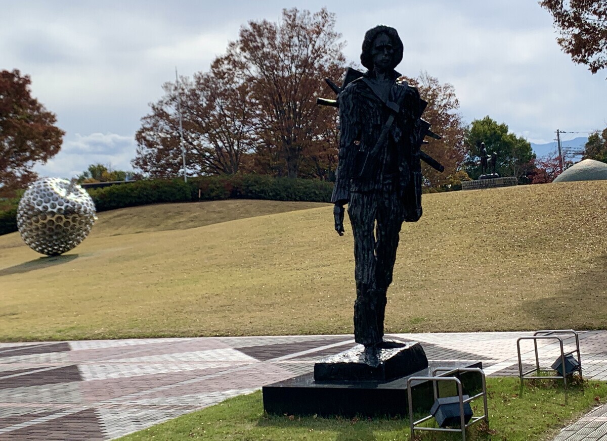 芸術の森公園は、山梨県立美術館と県立文学館を含み、6haもある広々とした園内随所に彫刻を配置した公園である。美術館前のこの黒い彫刻は、エミール=アントワーヌ・ブールデル作の「ケンタウロス(1914)」であり、奥に見える白い彫刻は、岡本太郎作の「樹人(1971)」である。美術館のミレー館には、ジャン=フランソワ・ミレーの「種をまく人(1850)」「落穂拾い、夏(1853)」など有名な作品がたくさんあったが、残念ながら撮影禁止であった。他にも写実主義のギュスターブ・クールベやバルビゾン派のジュール・デュプレなどの作品などがあった。